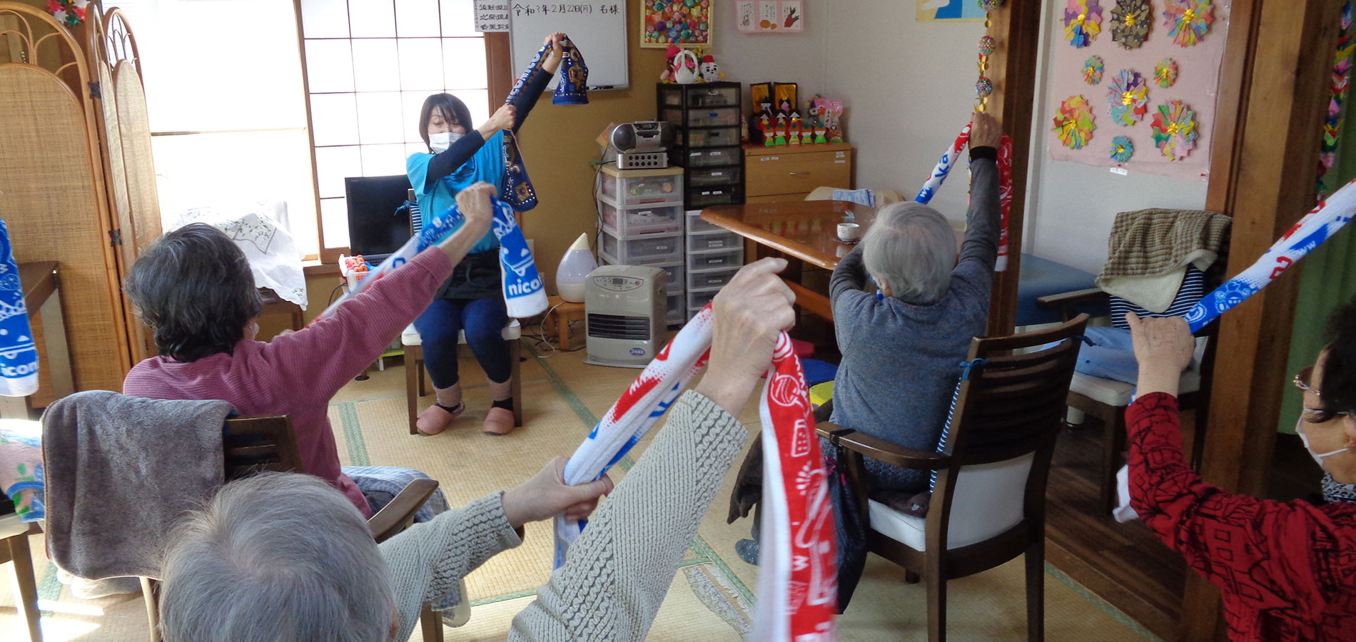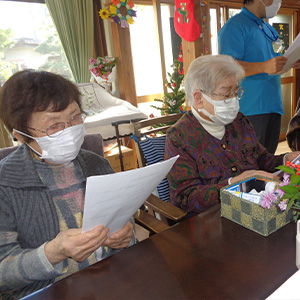 目配り、気配り、心配りを大切に、いつも笑いの絶えない、明るく、楽しい、アットホームなデイサービスであり続けたいと思っています。